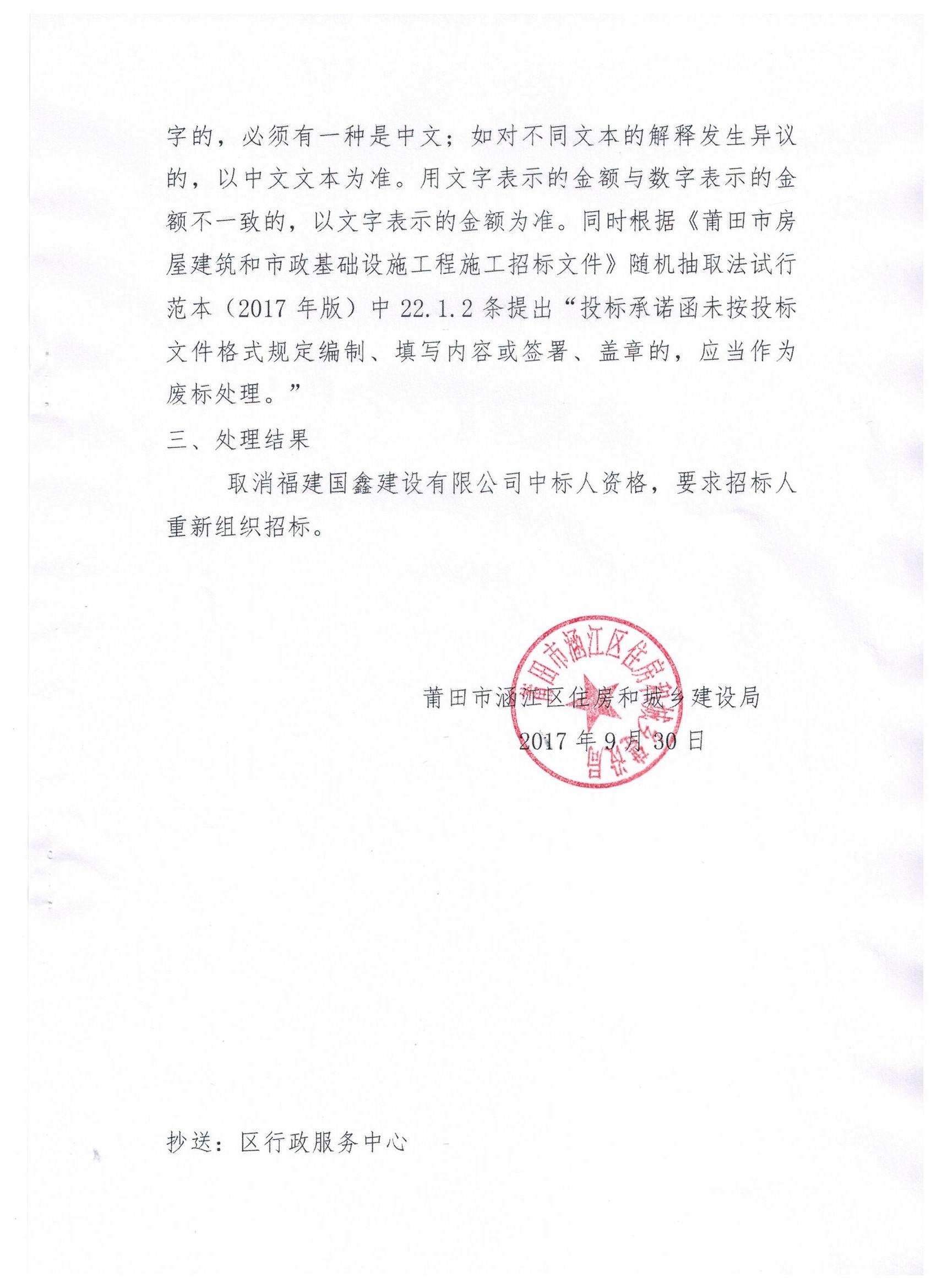 关于涵江区国欢镇塘西小学迁建工程土方工程招投标投诉处理的通知