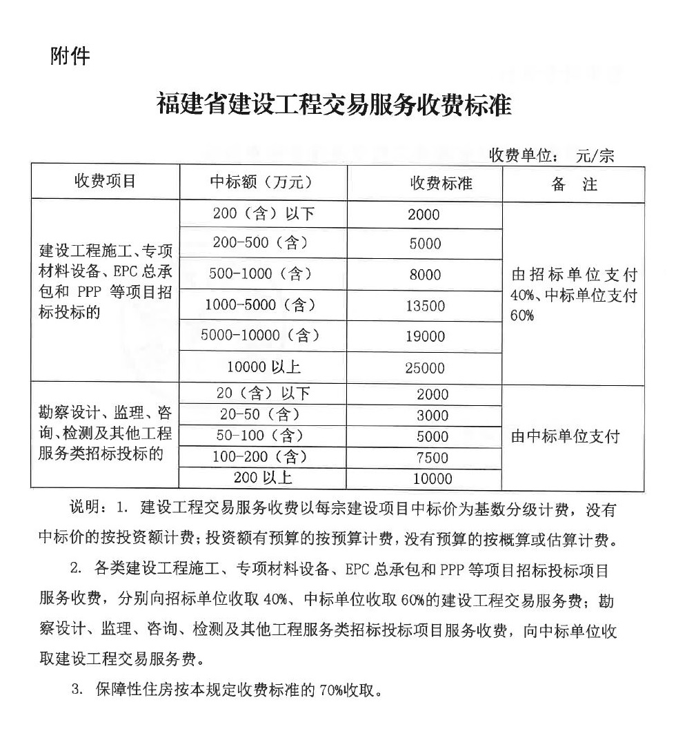 莆田市公共资源交易中心已于2019年6月将全部建设工程项目交易权限下放至各县区交易平台。为进一步贯彻落实《福建省人民政府关于进一步降低实体经济企业成本的若干意见》(闽政〔2017〕24号)精神,切实减轻企业和社会负担,优化营商环境,经研究,决定自2019年7月1日起,涵江区建设工程交易服务收费按照《福建省物价局关于规范建设工程交易服务收费有关问题的通告》(闽价通告〔2018〕9号)文件执行。具体收费标准见附件。