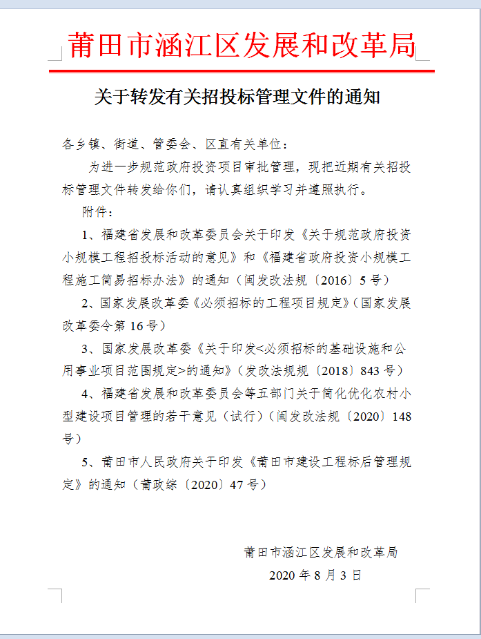 莆田市涵江区发展和改革局关于转发有关招投标管理文件的通知