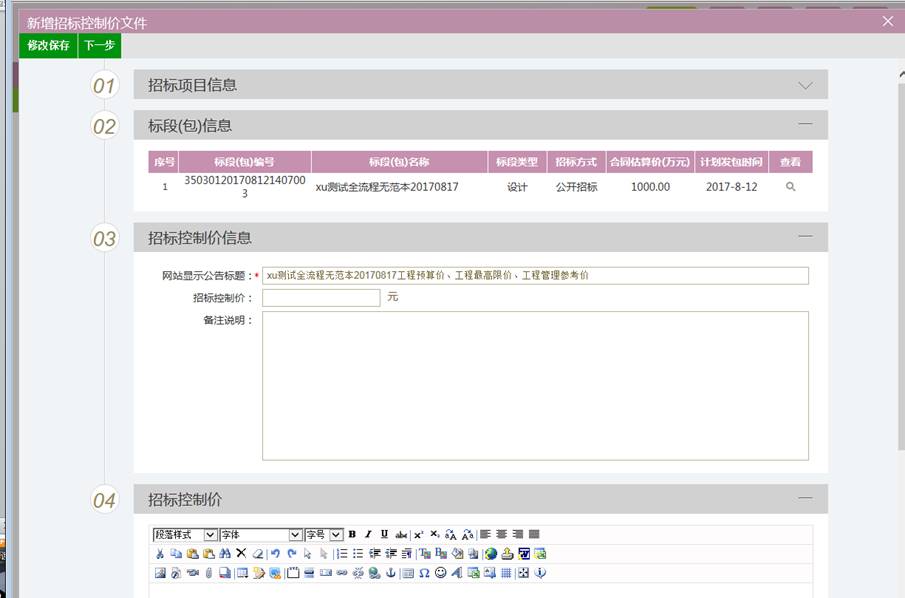 2.点“新增记录”,选择标段,转到如下的页面中,填写“最高限价”,并把公告标题与内容填写进去,点“提交审核”即可