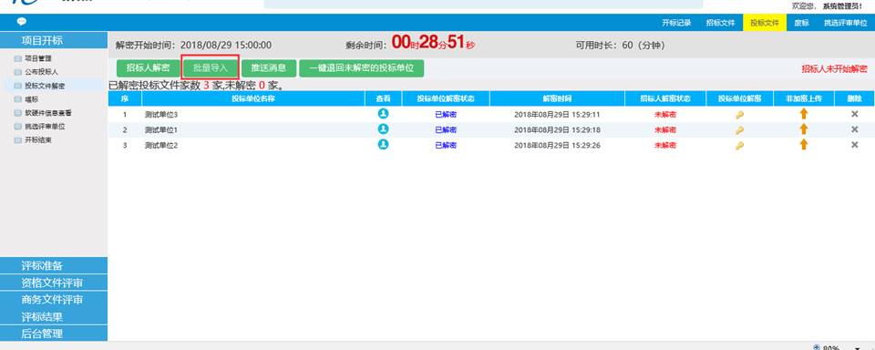 2、 等待所有投标人解密完毕后,点击招标人解密,完成后再点导入批量导入,进行投标文件的导入。