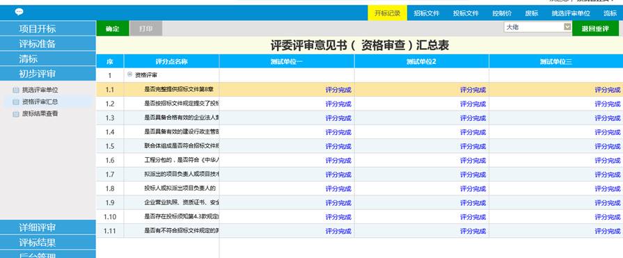 1、选择初步评审——资格评审,可对投标单位进行资格文件评审,如下图