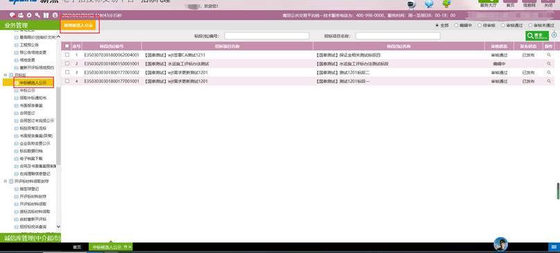 前提条件:评标结束,产生了中标单位,已发布中标候选人公示;