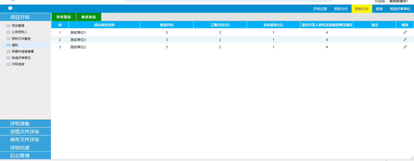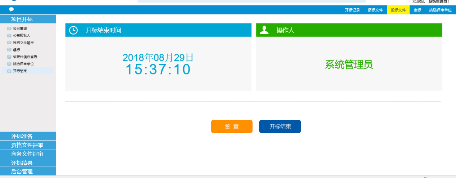对上述流程都操作完毕,确认无误后,点击开标结束,结束开标这一环节。