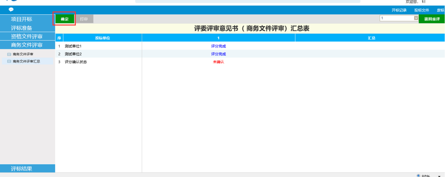 1、对专家的技术文件评审结果进行汇总,如确认无误后点击确定,如有疑问或者其他操作也可点击右上方的退回重评。