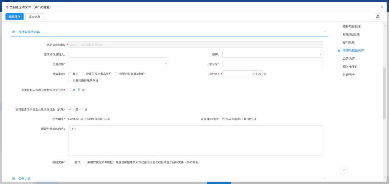 3.输入各项澄清修改信息,点下一步填好信息“提交信息”提交给建设单位审核即可。