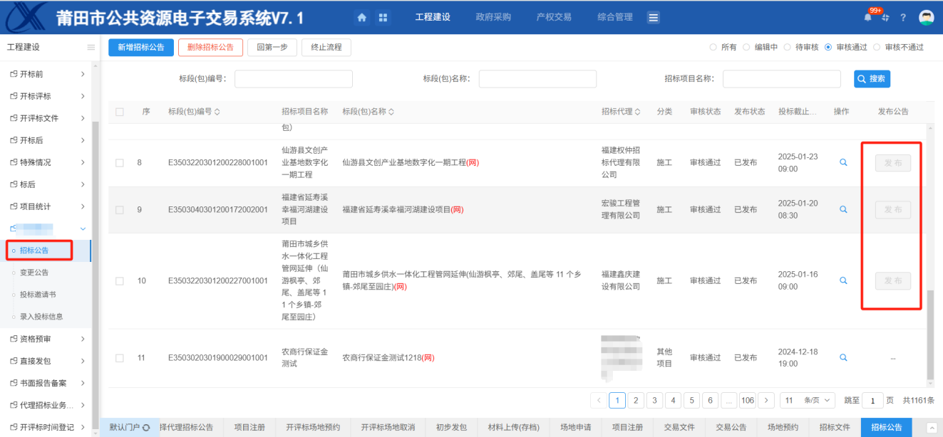 操作步骤:招标文件审核通过才可以发布公告