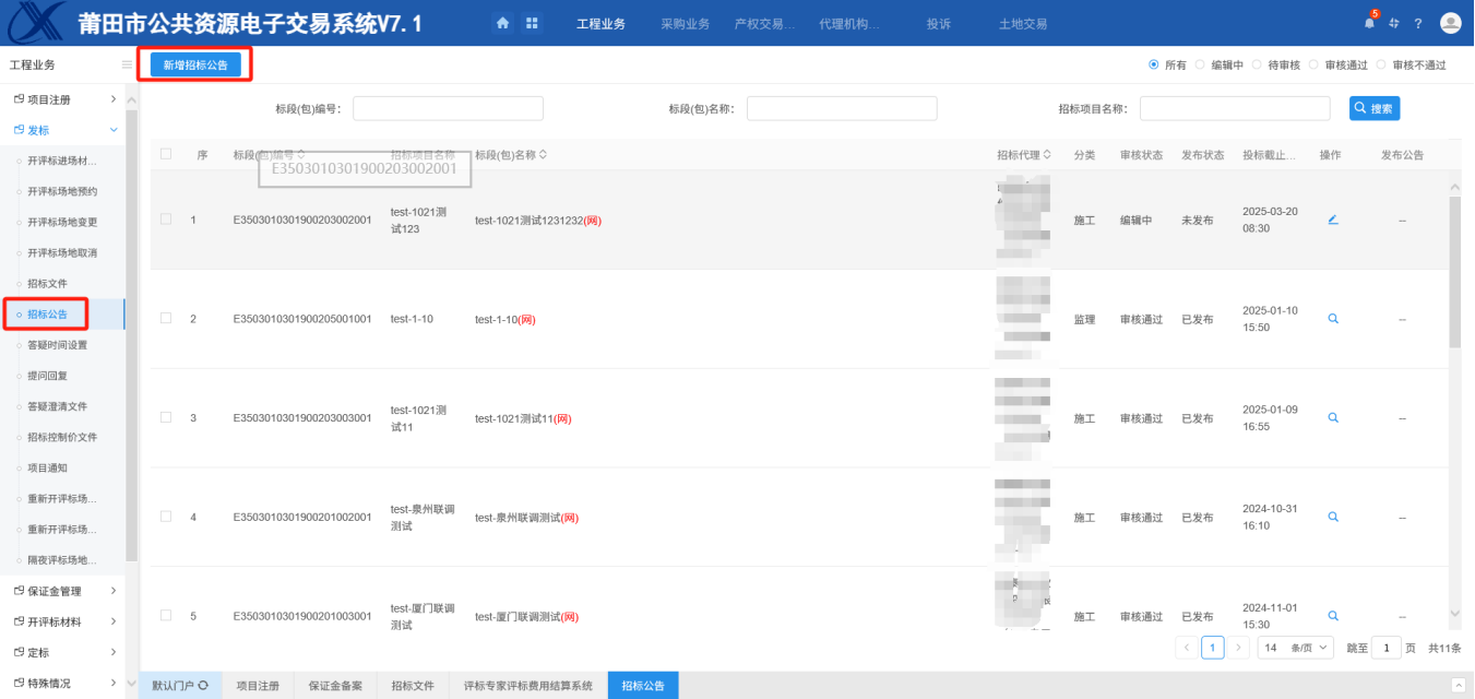 2.点“新增公告”,选择标段