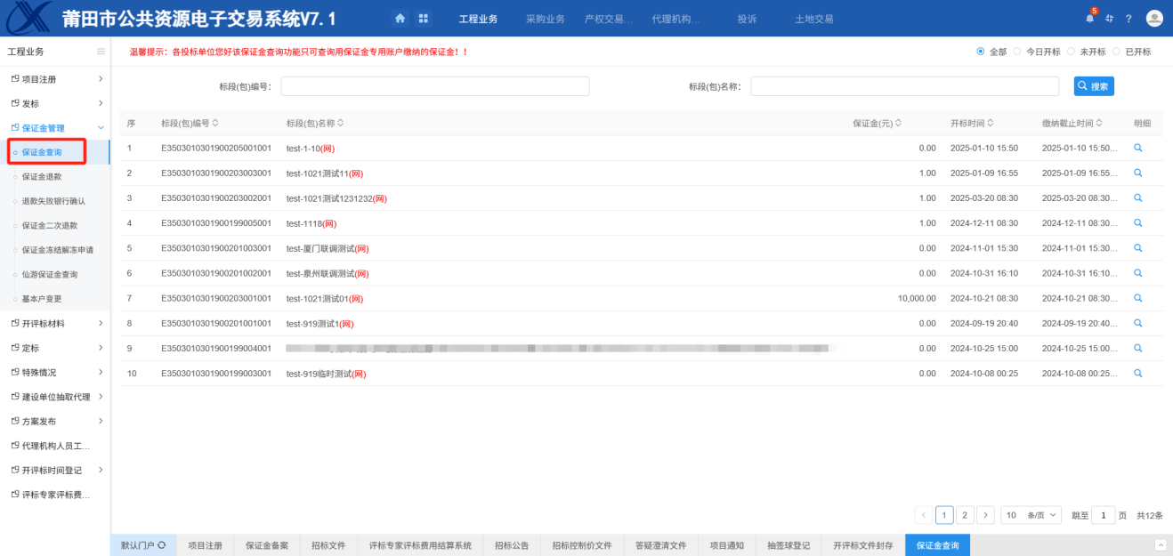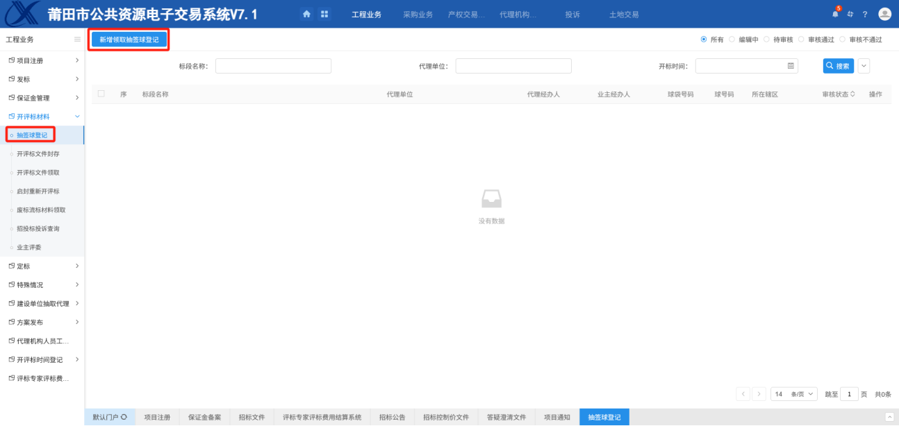 操作步骤:1.申请领取抽签球 2.归还球和材料封存 3. 开标进行保证金公布申请查询