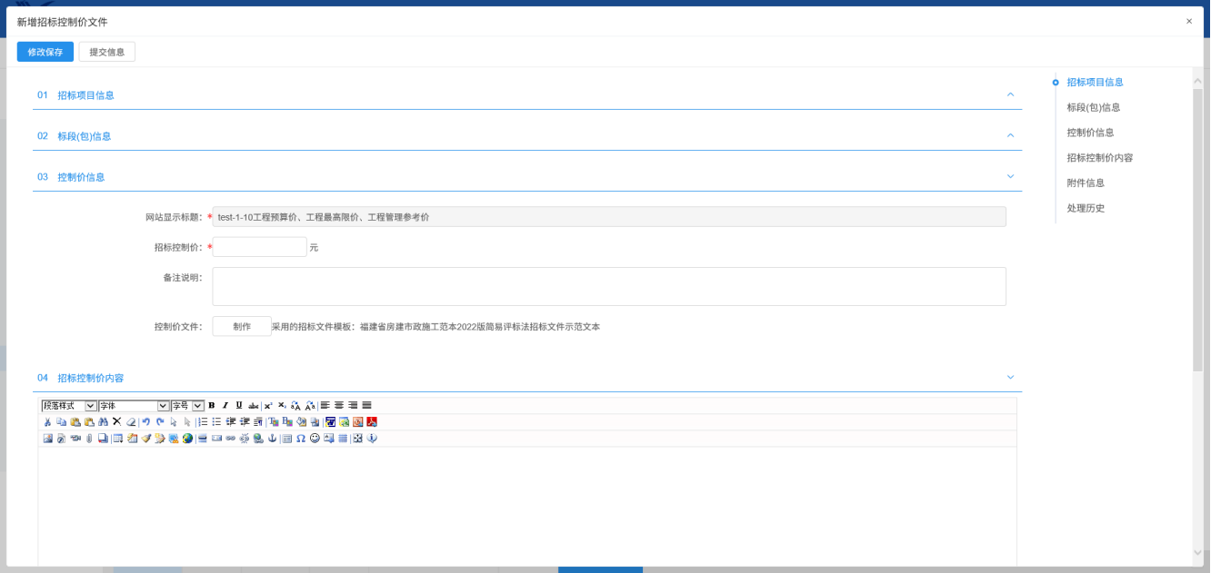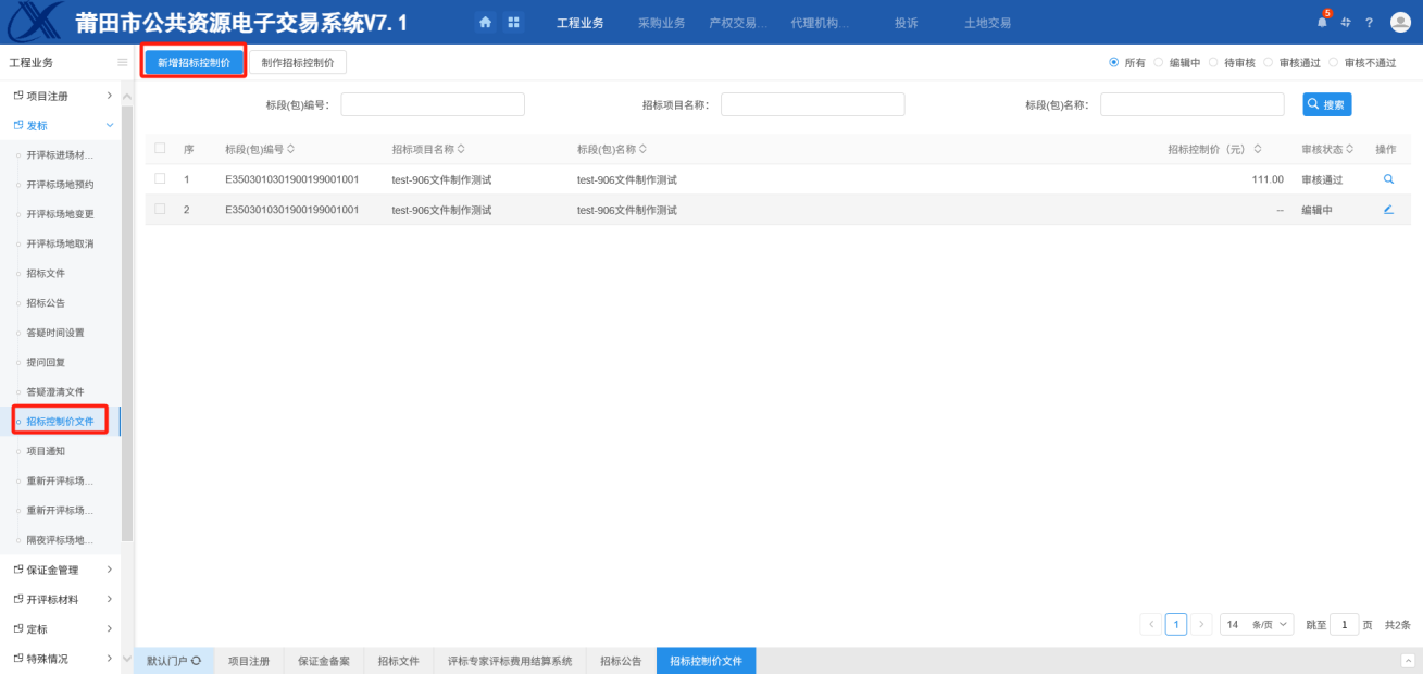 操作步骤:招标公告发布后才可新增制作招标控制价