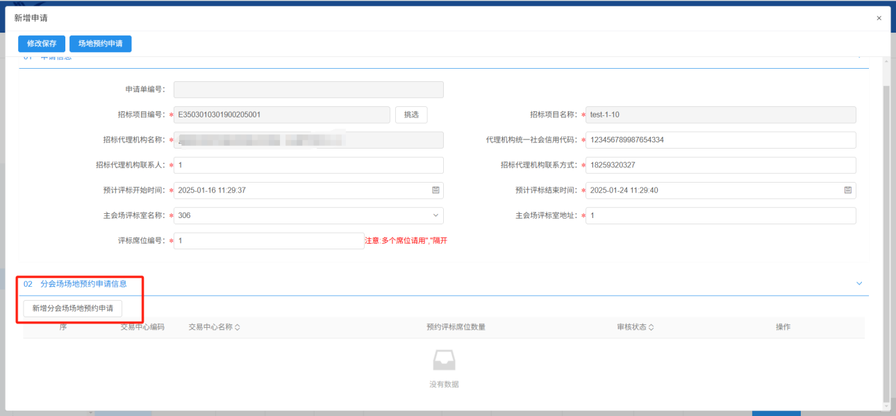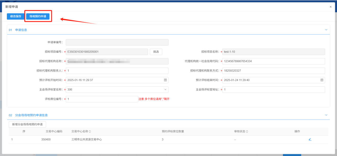 5、点击“新增分会场场地预约申请”,选择对应分中心