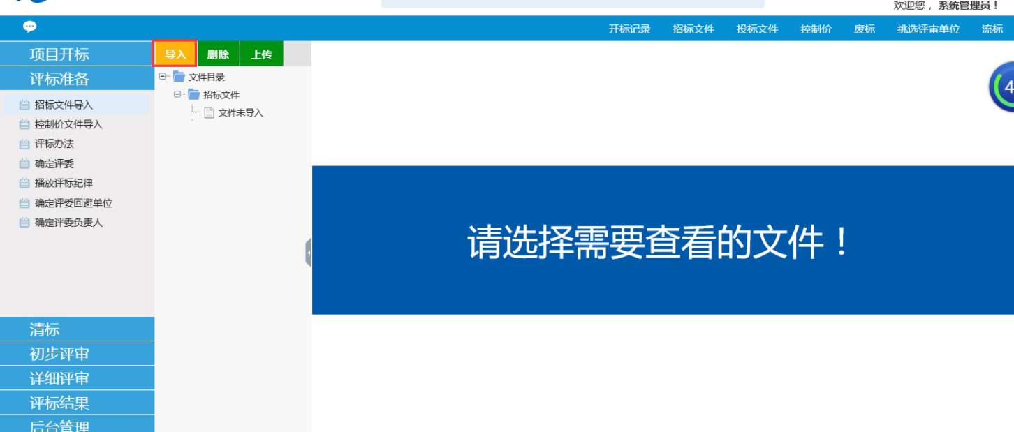 1、选择评标准备——招标文件导入,点击导入按键,将您已经上传到网上的招标文件进行导入(也可点击上传,在将你准备好的文件上传到系统)