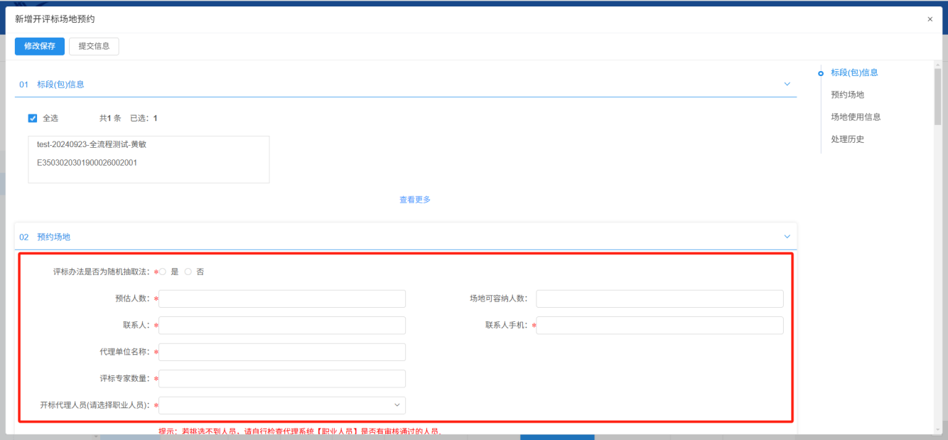 3.先填写预估人数,选择开评标时间,在提交前填写联系人、手机、代理单位名称,选择开评标室,若需更换系统所选的开评标室,需填写“不使用推荐开标室理由”;