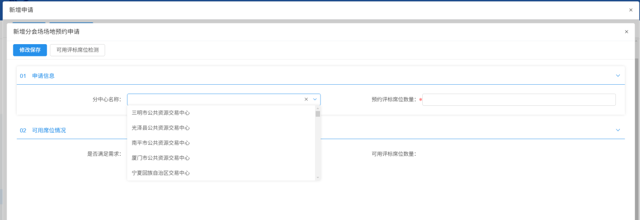 6、挑选对应分中心,输入席位数量后点击“修改保存”(注:当前仅宁德市支持远程异地评标)