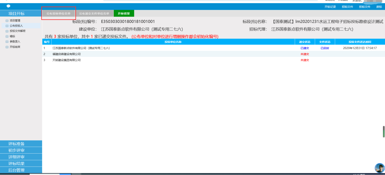 1、 进入项目后,点击左侧的公布投标人的公布投标单位名单(注:未到开标时间无法公布投标人)
