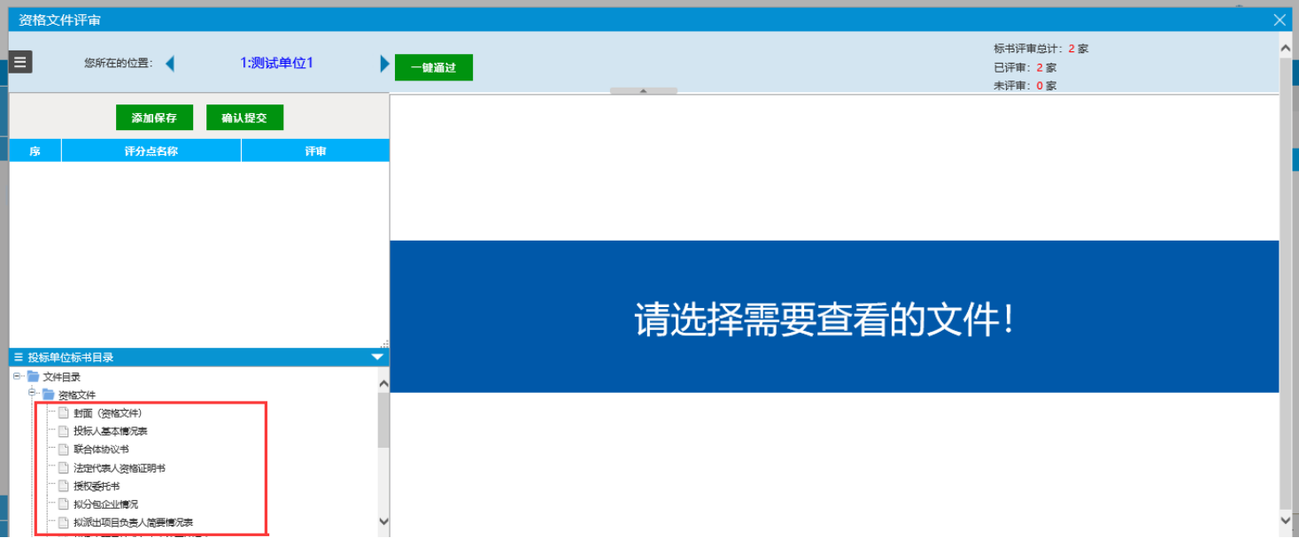 1、选择初步评审——资格评审,可对投标单位进行资格文件评审,如下图
