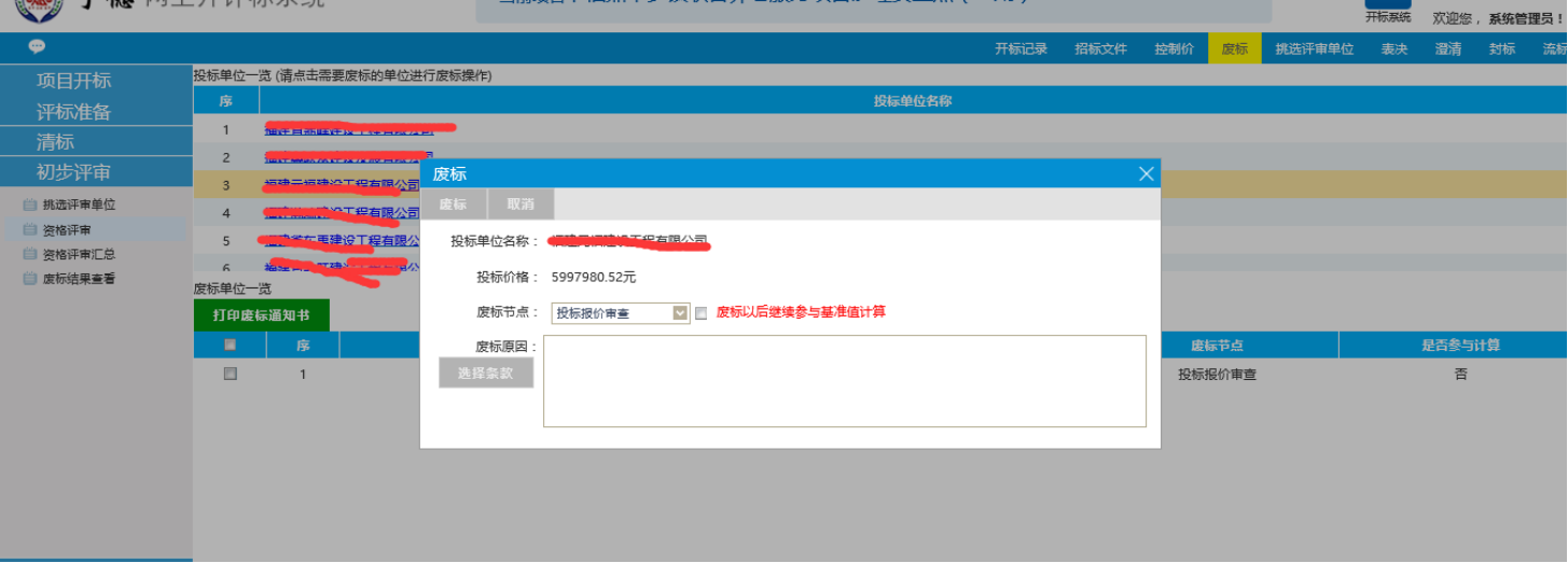 可选择投标方进行废标处理,如下图。(如操作失误,可点击